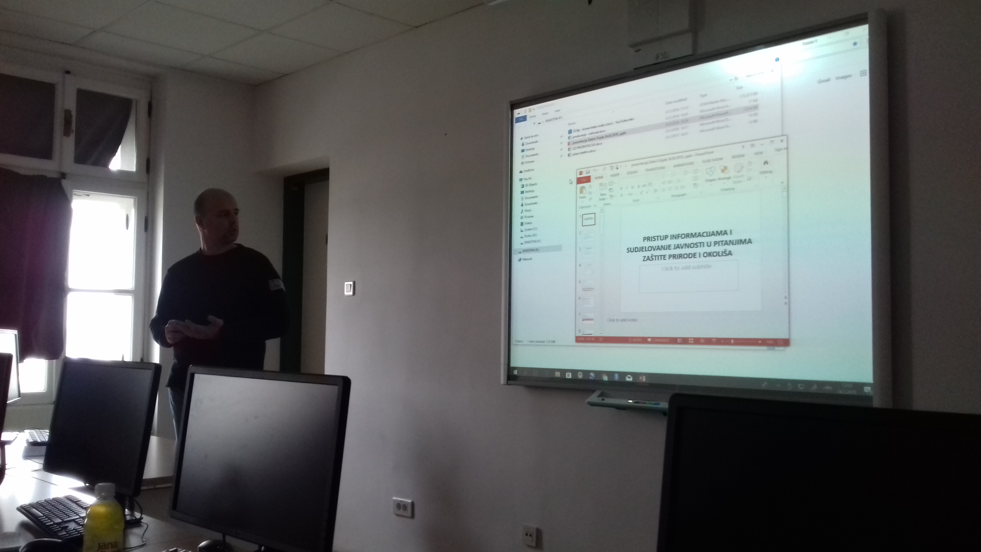 Teme o kojima se govorilo na predavanju bile su: Aarhuška konvencija i sudjelovanje javnosti u pitanjima zaštite okoliša i prirode, najčešća kršenja konvencije i iskustva okolišnih udruga, Program Zelenog telefona – služba za prijavu okolišnih problema na razini RH, izdvojeni slučajevi i koraci u njihovom rješavanju, iskustva Zelenog Osijeka i ostalih okolišnih udruga u provedbi projekata okolišnog prava i zagovaranja za veću transparentnost i otvorenost u upravljanju prirodnim resursima, Zelena pravna klinika – suradnja Zelenog Osijeka i Pravnog fakulteta u Osijeku kroz uključivanje studenata u rješavanje okolišnih problema, a napravljen je i kratak osvrt na slučajeve privatizacije sustava vodoopskrbe te vodnih resursa.
