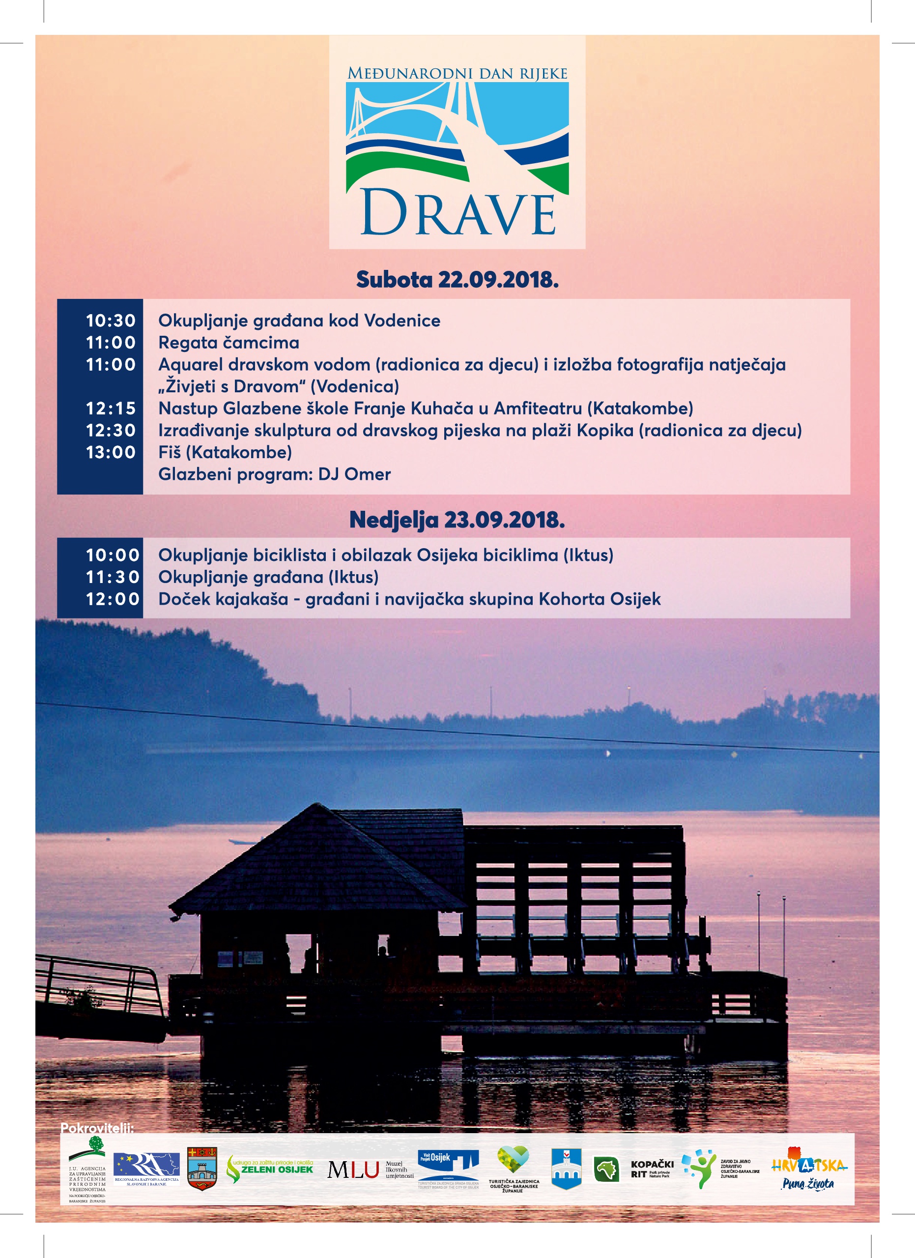 Subotnji program će početi u Vodenici u 11 sati (Gornjodravska obala) svečanom regatom čamcima, a za djecu će se održati radionica crtanja dravskom vodom koju će predvoditi djelatnici Muzeja likovnih umjetnosti iz Osijeka. U prostorijama Vodenice biti će izložene i pobjedničke fotografije Foto natječaja ˝Živjeti s Dravom˝. Drugi dio subotnjeg događanja nastaviti će se u Amfiteatru (Katakombe) gdje će građani imati priliku uživati u nastupu Glazbene škole Franje Kuhača i DJ Omera.