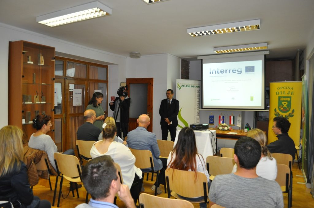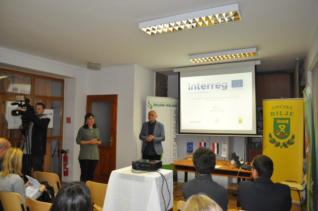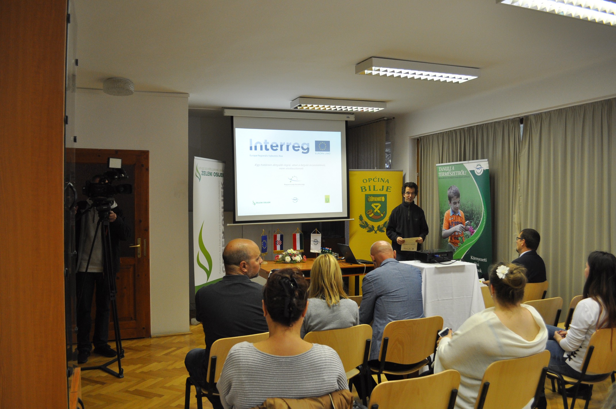 Voditelji projekta Dinko Pešić ispred Zelenog Osijeka, Szilvia Wodtke ispred DDNPI i Ivana Plaščak ispred Općine Bilje predstavili su projektne rezultate. Prisutne su pozdravili i direktor Nacionalnog parka Dunav-Drava Szabolcs Závoczky te načelnik Općine Bilje Željko Cickaj.