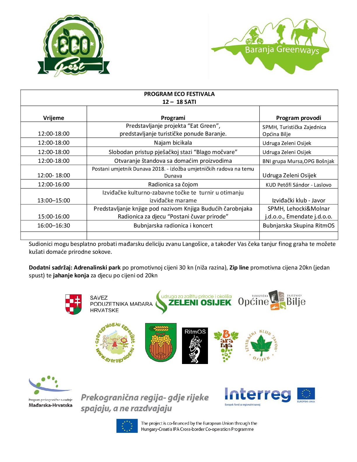 Na program toga dana je predstavljanje projekta Eat Green, predstavljanje turističke ponude Baranje, otvaranje štandova sa domaćim proizvodima, radionica sa čojom, izviđačke kulturno-zabavne točke te turnir u otimanju izviđačke marame, predstavljanje knjige pod nazivom Knjiga Budućih čarobnjaka, radionica za djecu Postani čuvar prirode, bubnjarska radionica i koncert, slobodan pristup pješačkoj stazi Blago močvare i druge aktivnosti.